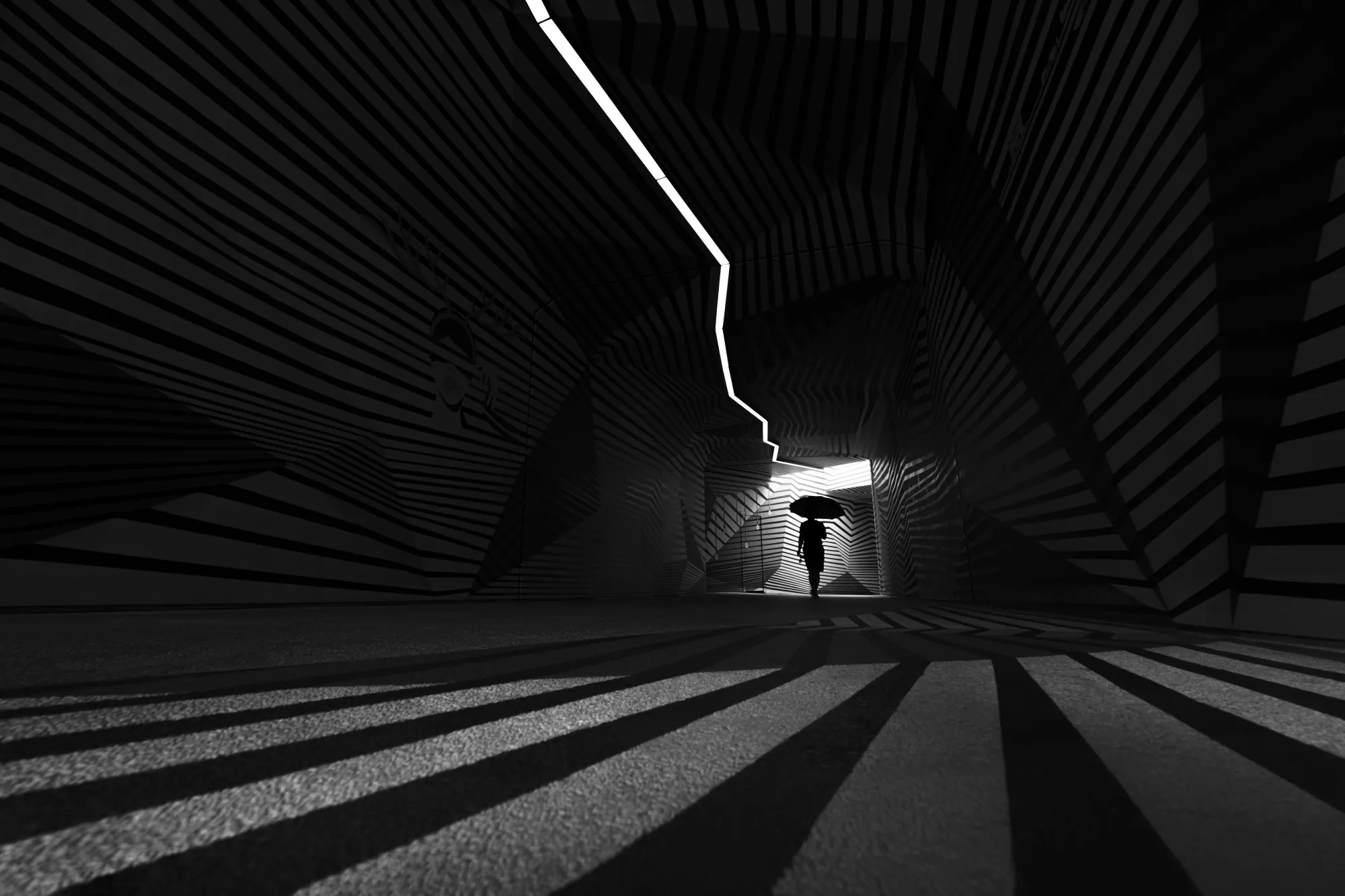 A pedestrian with a parasol walks through an underground tunnel. The overhead lighting makes it appear as if lightning is striking the umbrella.