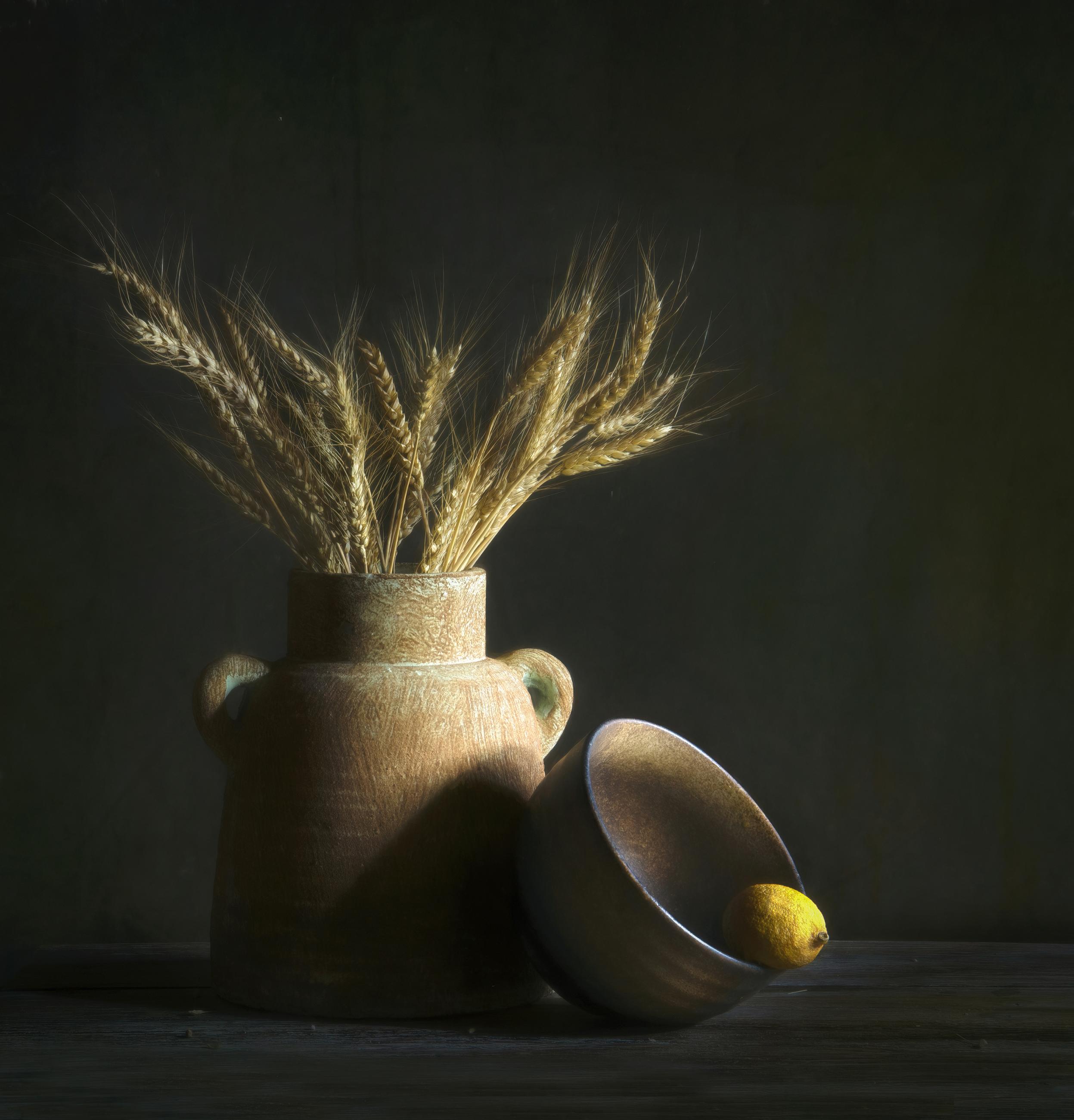 I used a painting with light technique to create this still life of wheat and a lemon.