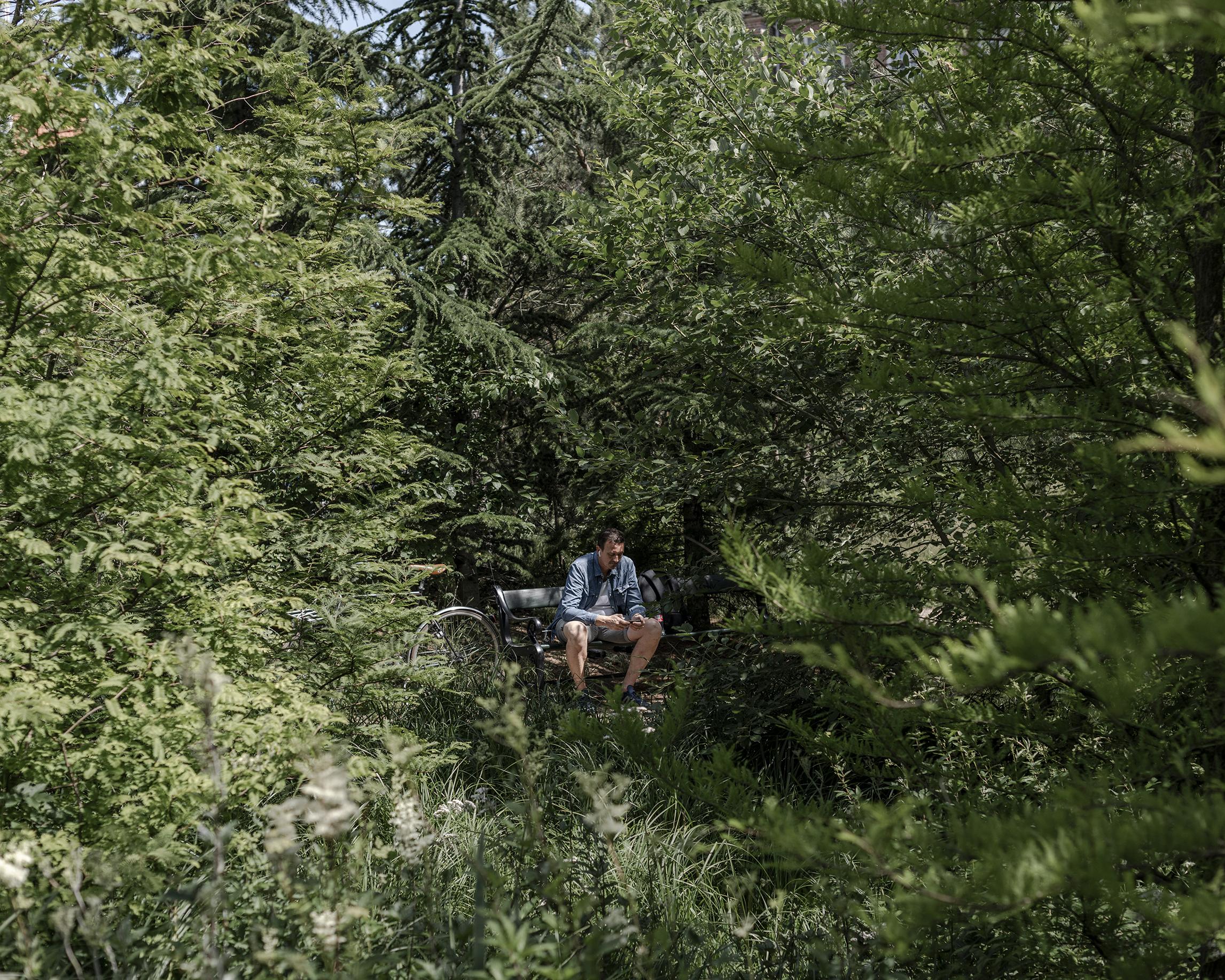 In Sankt Kjelds Plads, which was hit by flooding in 2014, the city of Copenhagen wanted to get a better understanding of how much greenery and forest-like areas could be created within the city, while at the same time handling rainwater and cloudbursts. Here, a cyclist rests in the middle of a green-arranged roundabout in Sankt Kjelds Plads. This coexistence of nature and urban infrastructure is believed to be the future of sustainable cities. Copenhagen, Denmark.