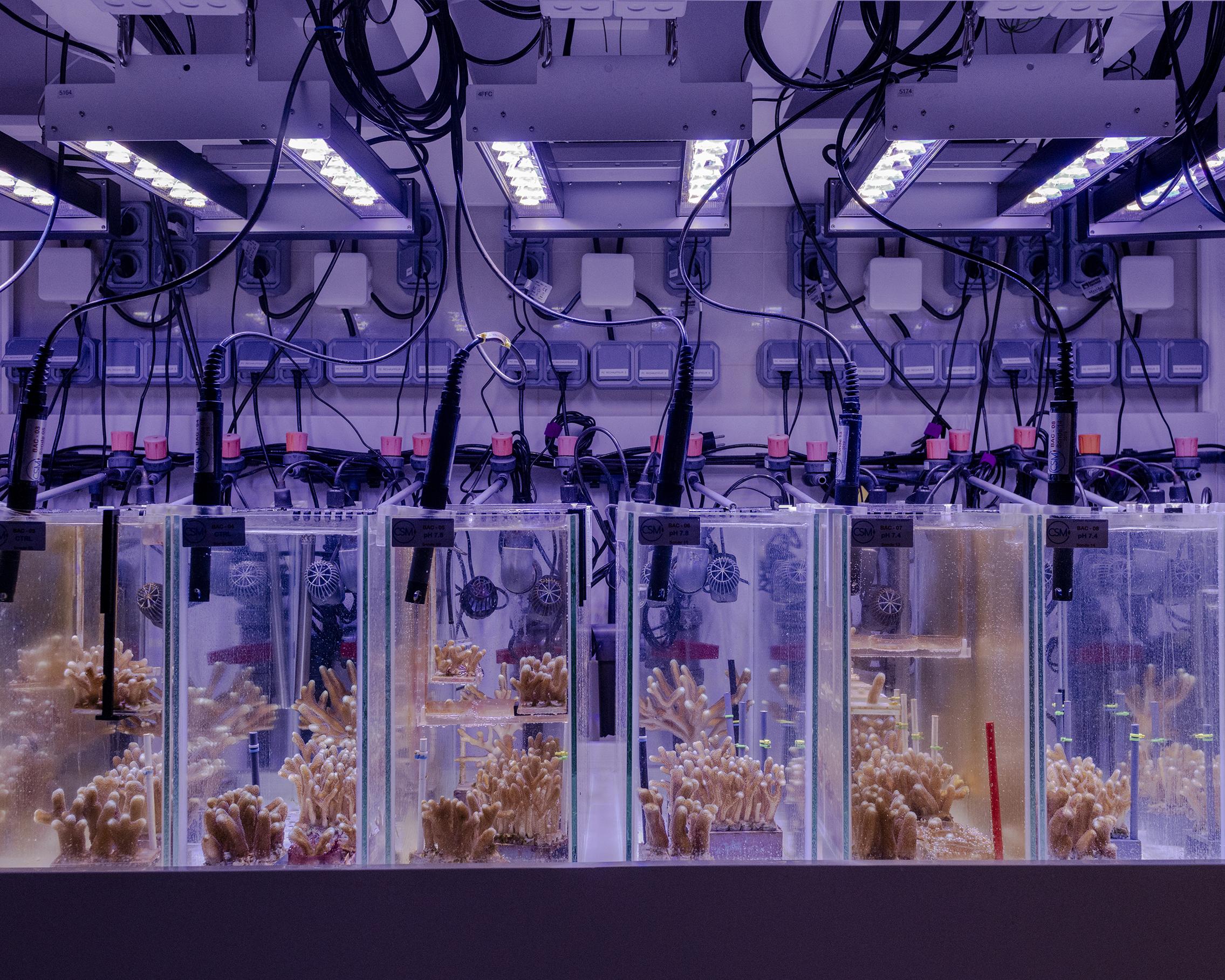 In part of the laboratory at Monaco Scientific Center (CSM), the world's biggest coral research base, an experiment has been running in tanks for the past 14 years. Here, Stylophora pistillata polyps are subjected to the probable acidification of the oceans by 2100, caused by the absorption of atmospheric CO2 accumulated due to human activity. This enables scientists to observe how they adapt and what structural changes they are going through. Monte Carlo, Monaco.
