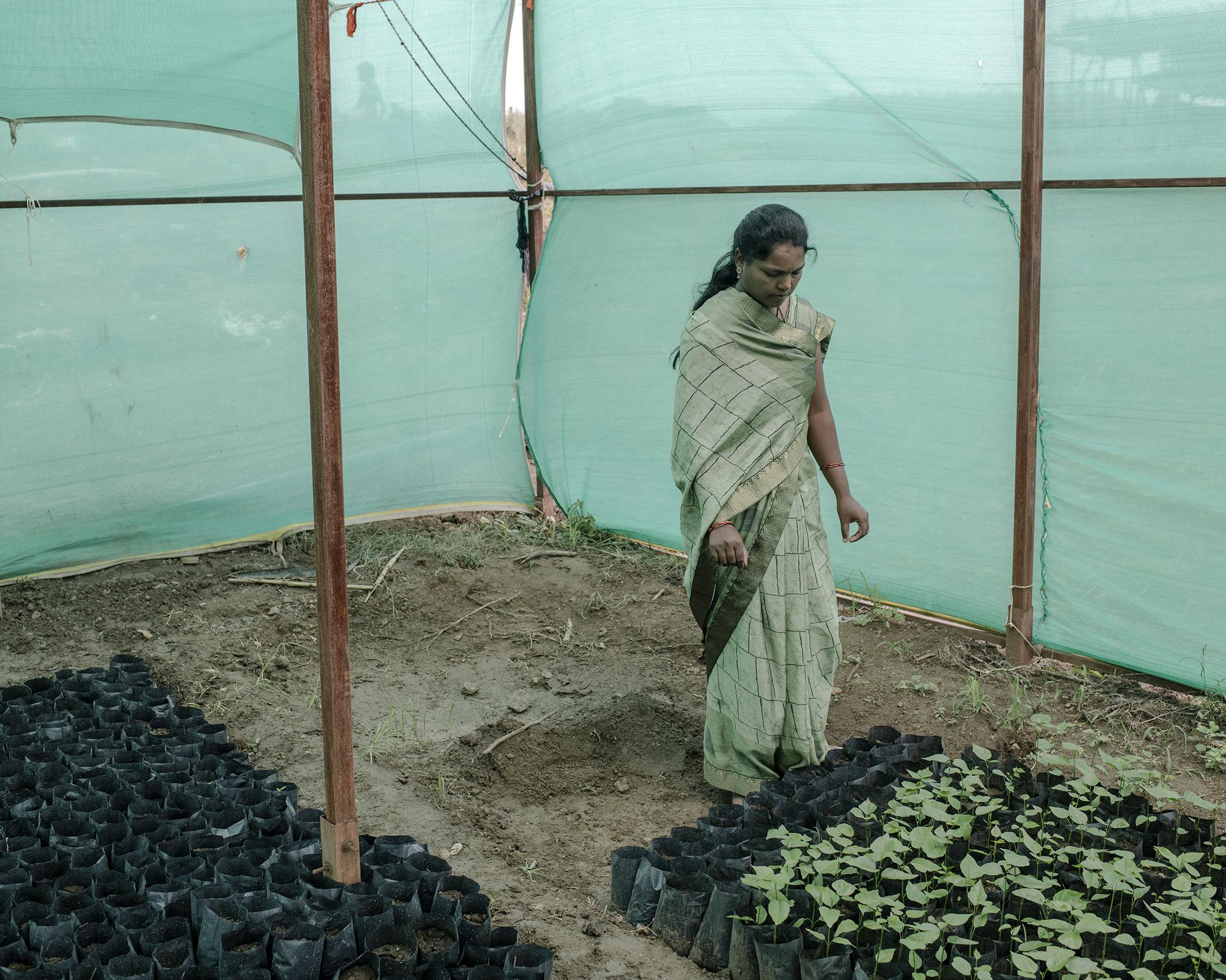 Shalu Khandate from Sawangi village survived on genetically modified cotton production until just a couple of years ago. Since then, with help from the Srijan association, she and other women from her community started growing vegetables and other crops. She also opened a greenhouse where she grows seedlings from red gram, Mahua plant (Madhuca longifolia) and other local plants. She says she no longer depends on monsoons for survival. Sawangi village, Madhya Pradesh, India.